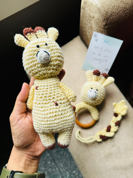 Crochet Newborn Hamper - soft toy, wooden teether, pacifier holder