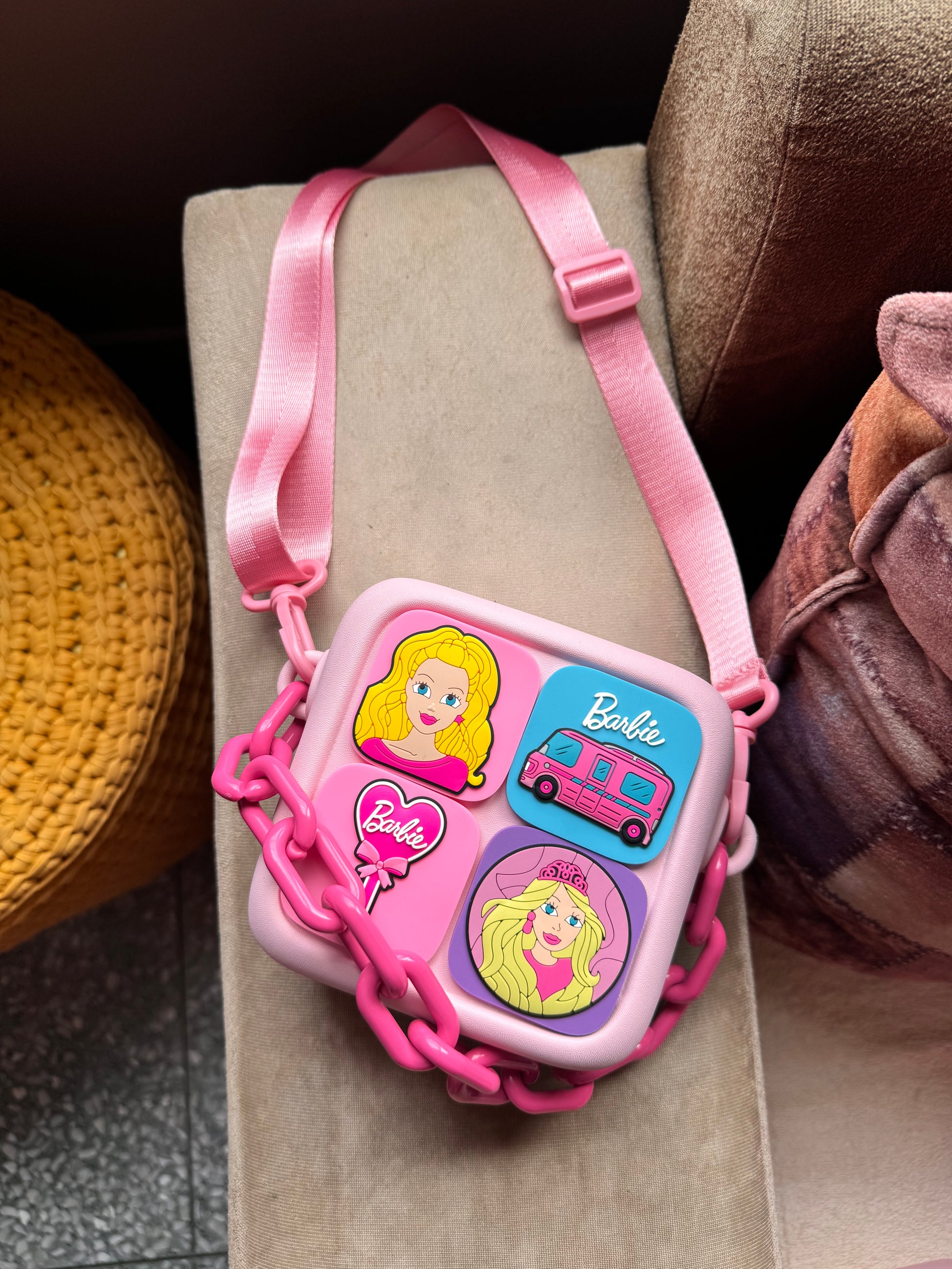 Let your little fashionista step out in style with this super cute and colorful Barbie Sling Bag! Perfect for girls who love Barbie and all things fun, this bag features four detachable badges including Barbie portraits, a camper van, and a cute lollipop logo. The bold pink chain handle adds a trendy touch while making it easy to carry for everyday adventures.