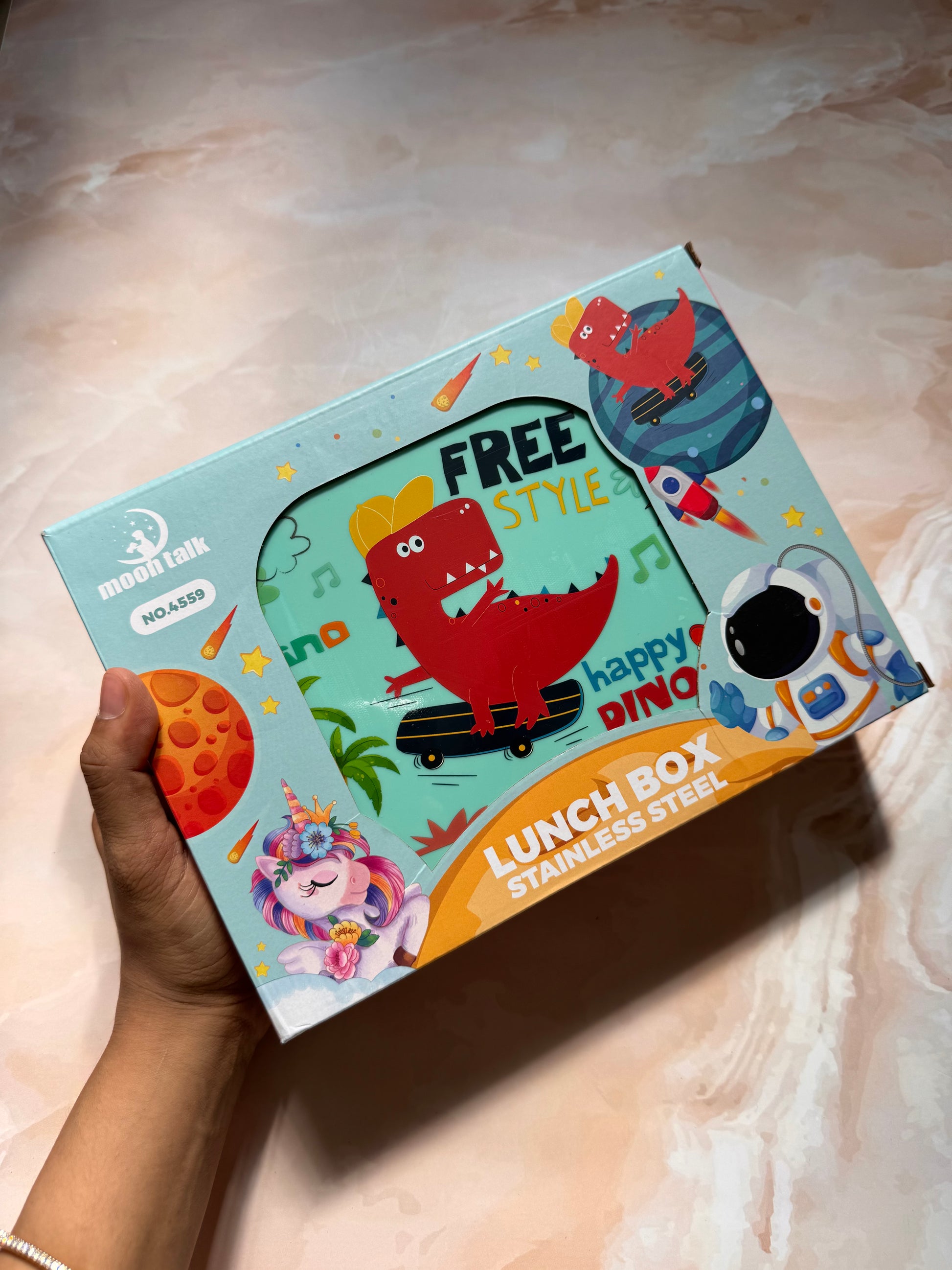 Packed with personality! This fun Dino, Unicron, Space themed lunch box features a sturdy stainless steel interior and vibrant outer packaging. Keeps food warm and fresh — perfect for school-going kids.