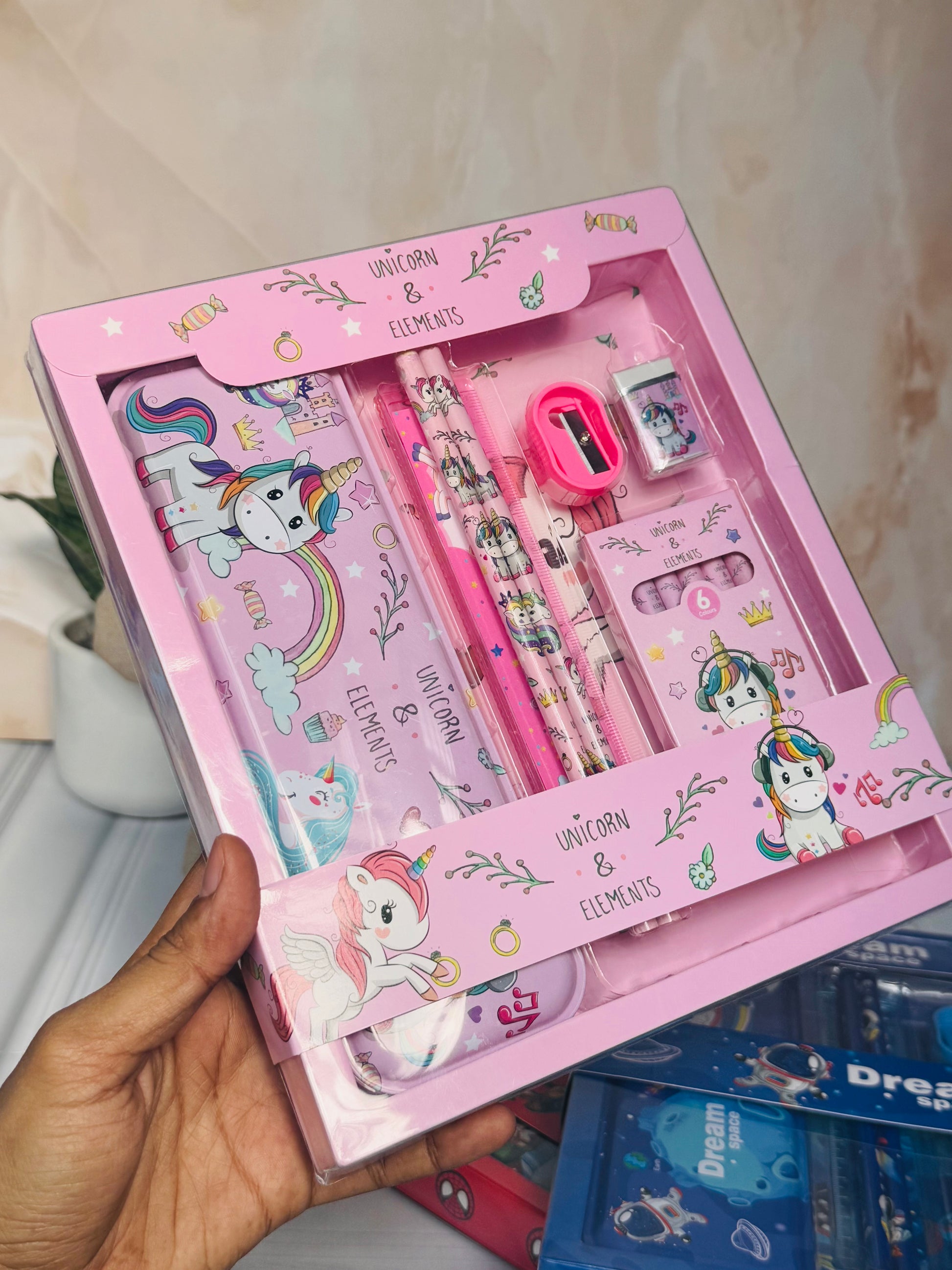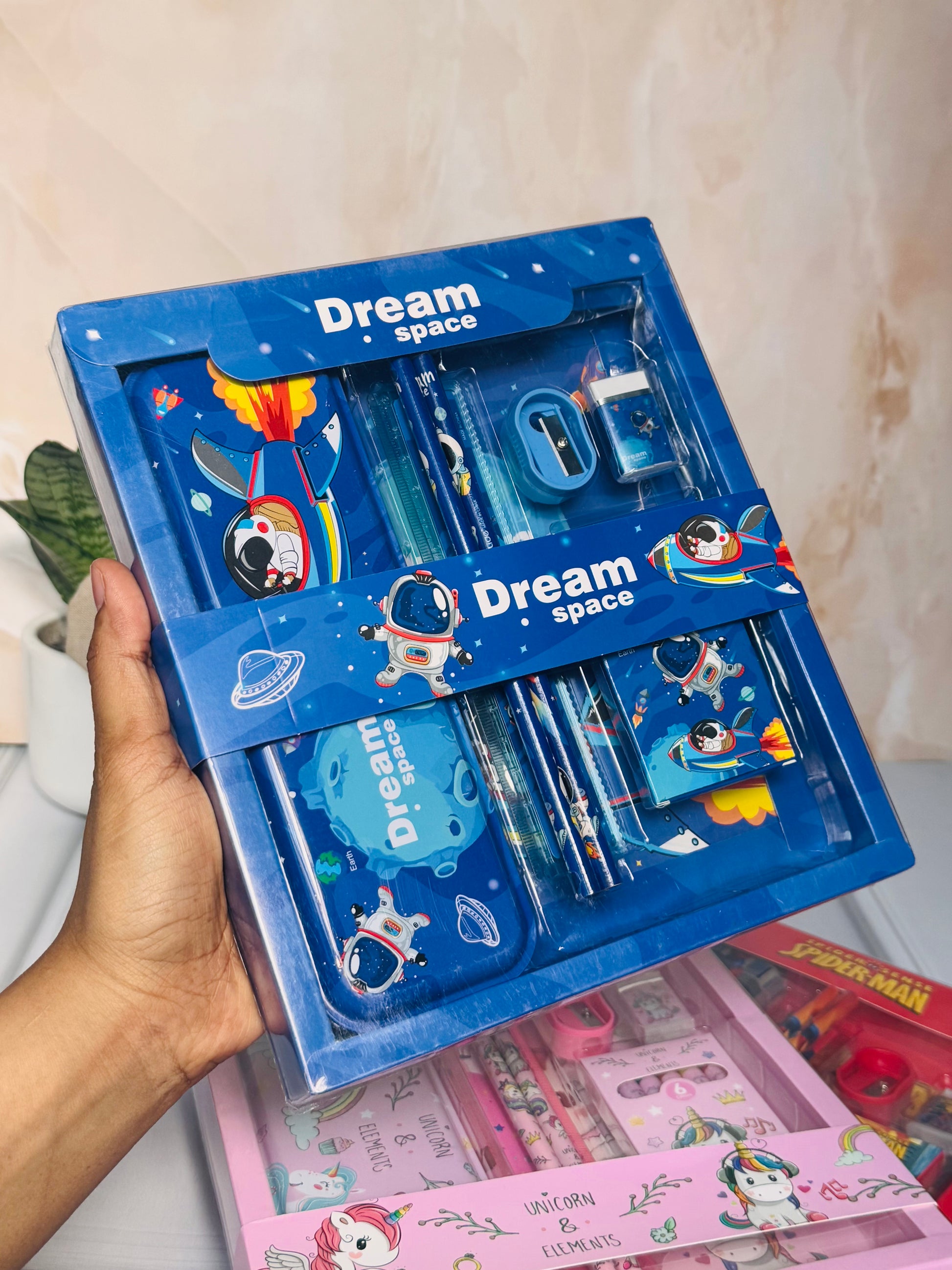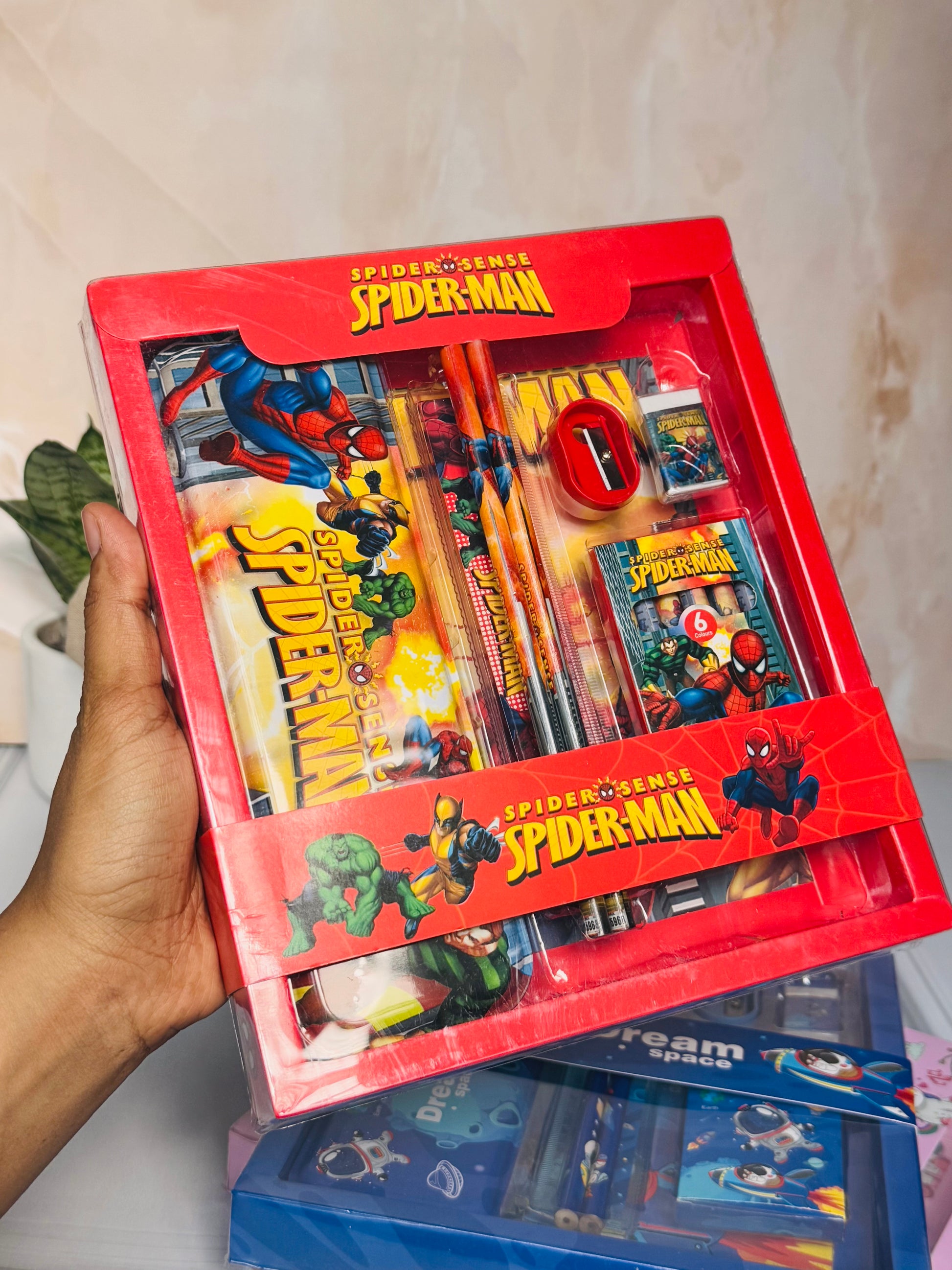 Packed in a vibrant space, unicorn and spiderman -themed box, it makes a great return gift, school starter kit, or birthday present for boys and girls.